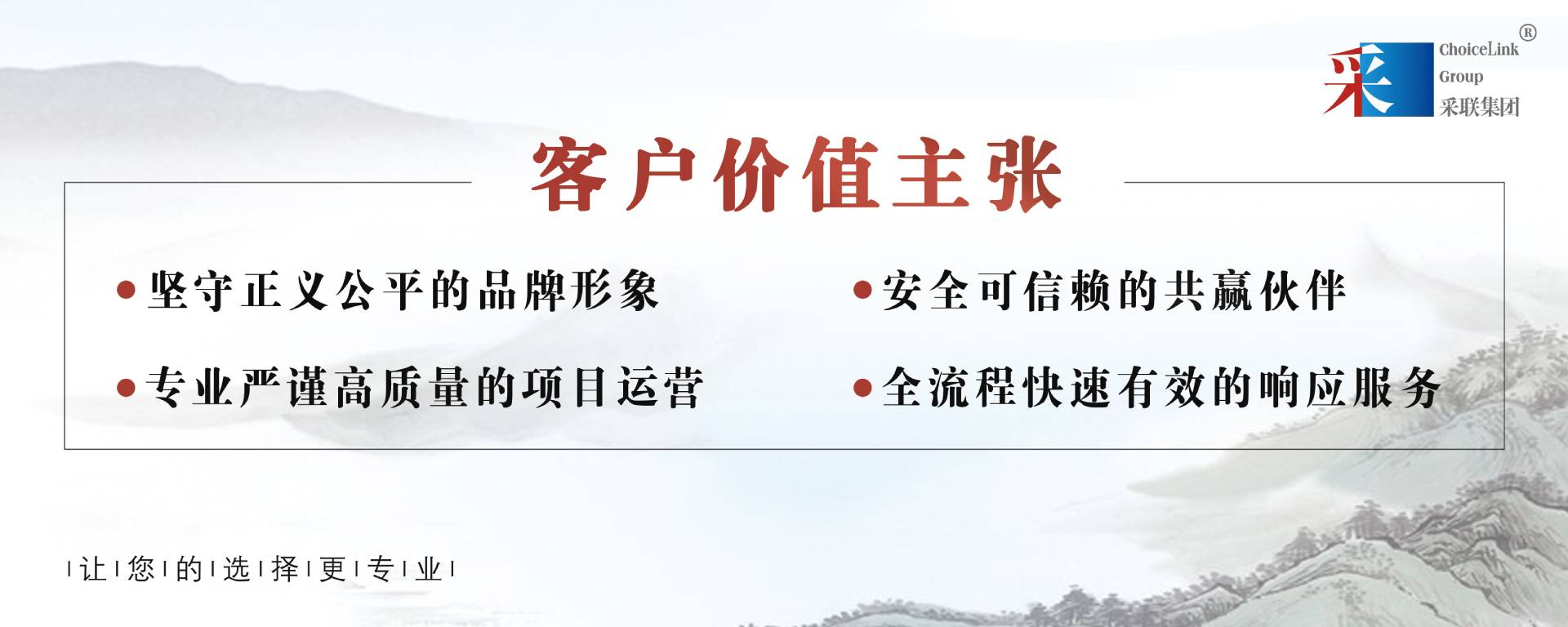 采聯(lián)集團致力于為廣大客戶提供采購全流程專業(yè)服務(wù),堅守“守正出奇”的核心價值觀,以公平公正為原則,不斷優(yōu)化服務(wù)、堅持創(chuàng)新發(fā)展。依托多元化、專業(yè)化的服務(wù),不斷向“締造最具創(chuàng)新力的采購服務(wù)品牌,構(gòu)筑采購領(lǐng)域最專業(yè)的資源交互平臺”的遠(yuǎn)大愿景邁進。